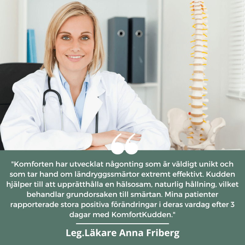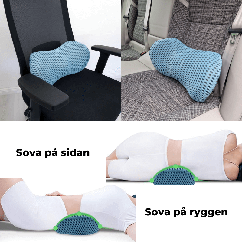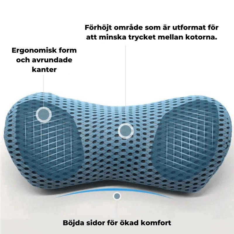 När du använder KomfortKudden™ får du stöd i den utsatta delen vid ländryggen så du kan inta en ergonomiskt korrekt hållning. Kudden är tillverkad av ett specialanpassat material gjort av minnesskum som anpassar sig till ryggradens form. Detta reducerar tryck på kotorna och de omgivande musklerna samtidigt som den förebygger fortsatta slitningar på ryggraden.